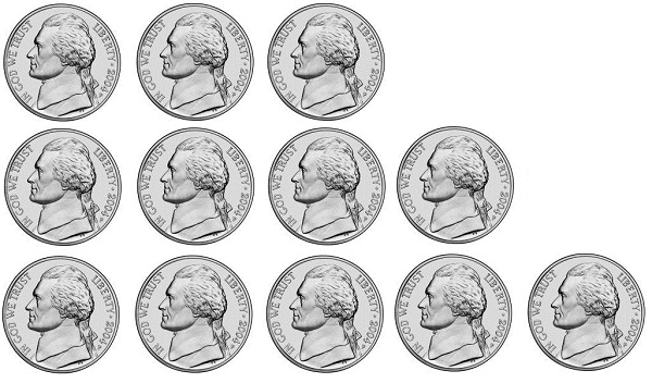 可以看到,第 2 列之和为奇数,所以这个本版的初始状态是不安全的。拿掉最上面一行的 2 枚硬币,第 1 行就变成了 1 ,从而留下了一个安全棋局。通过用其他方法试验,可以看到,拿掉第 1 行的 2 枚硬币是留下安全棋局的唯一操作。